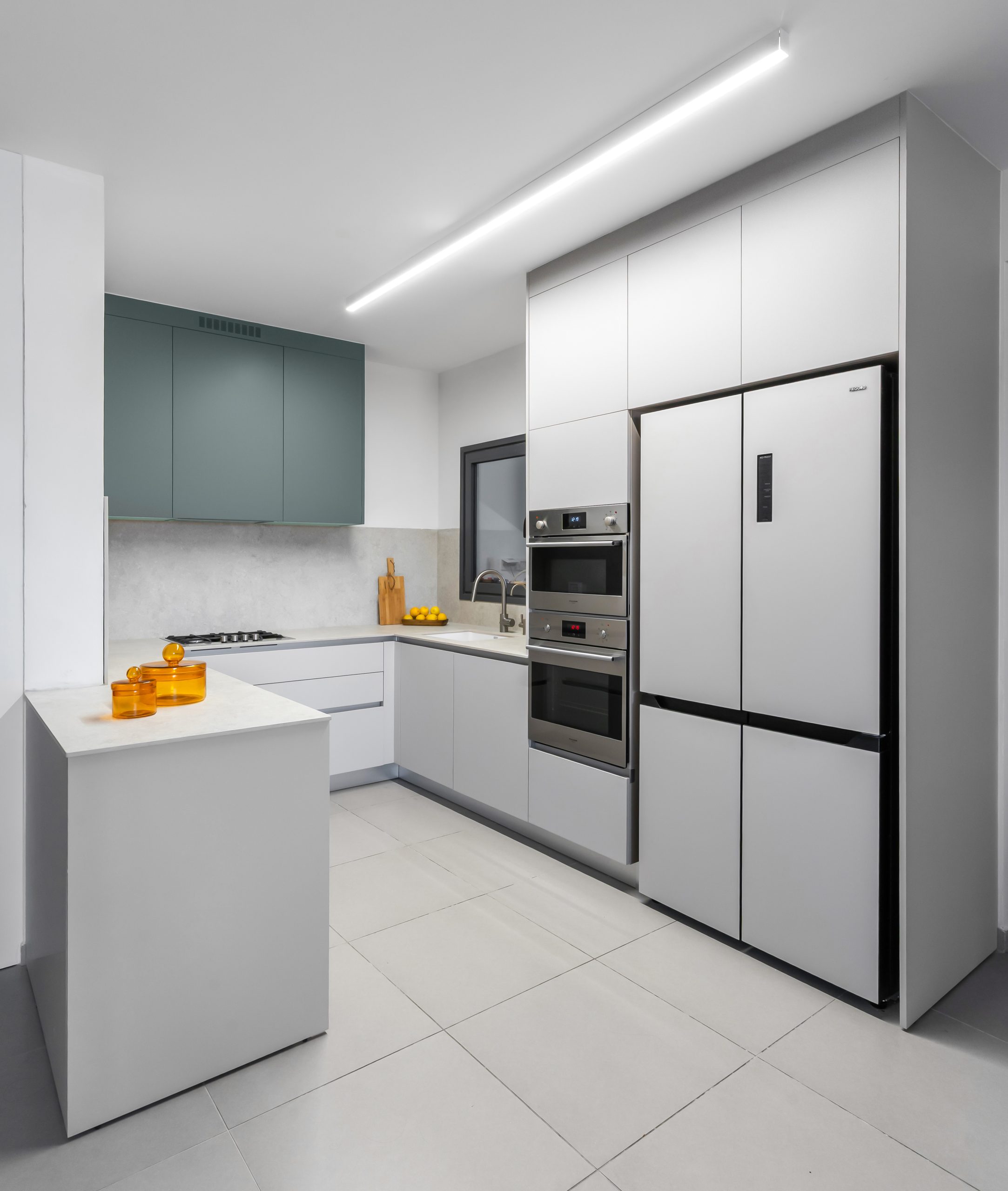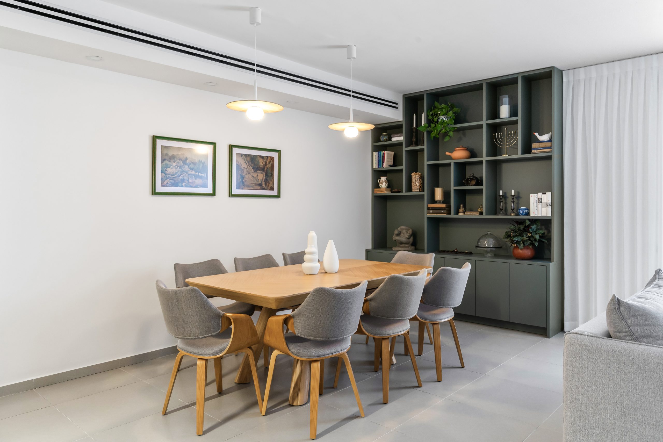 בחרנו בסגנון נורדי אירופאי, שמאוד מתאים לזוג ושילבנו בבית חפצים ואומנות בעלי ערך סנטימנטלי בני 50 שנה וחלקם אף יותר. הפרקטיות הייתה בראש סדר העדיפויות שלנו, בית שמארח בכל סופשבוע את כל הילדים והנכדים צריך להיות נוח וקל לתחזוקה, עם שולחן ל18 סועדים, עמדת בופה בספרייה ומתחתיה אחסון סרוויסים להגשה. הפרקטיות חזרה וליוותה אותנו בכל אחד מחדרי הבית, הן בבחירת הכלים הסניטריים והן בשפע של אחסון בנגרות אישית.