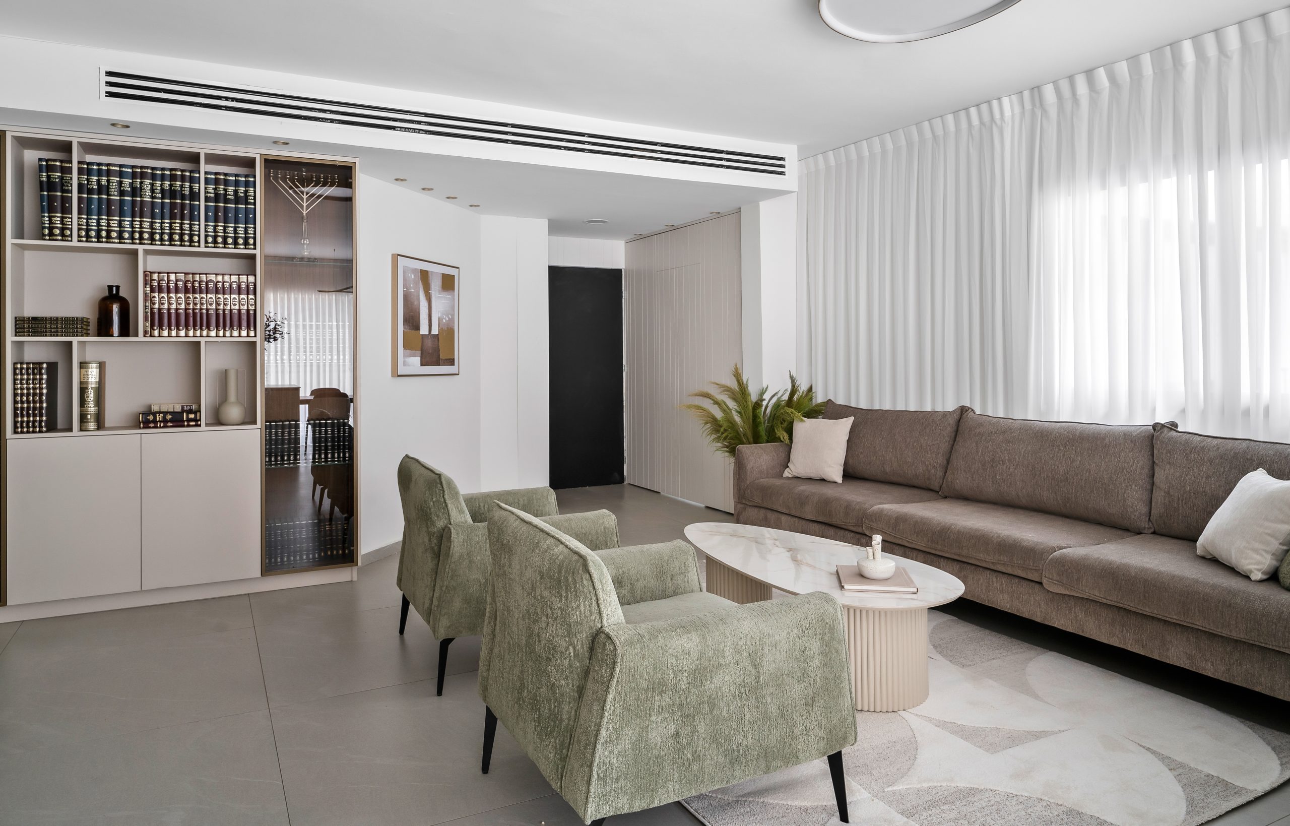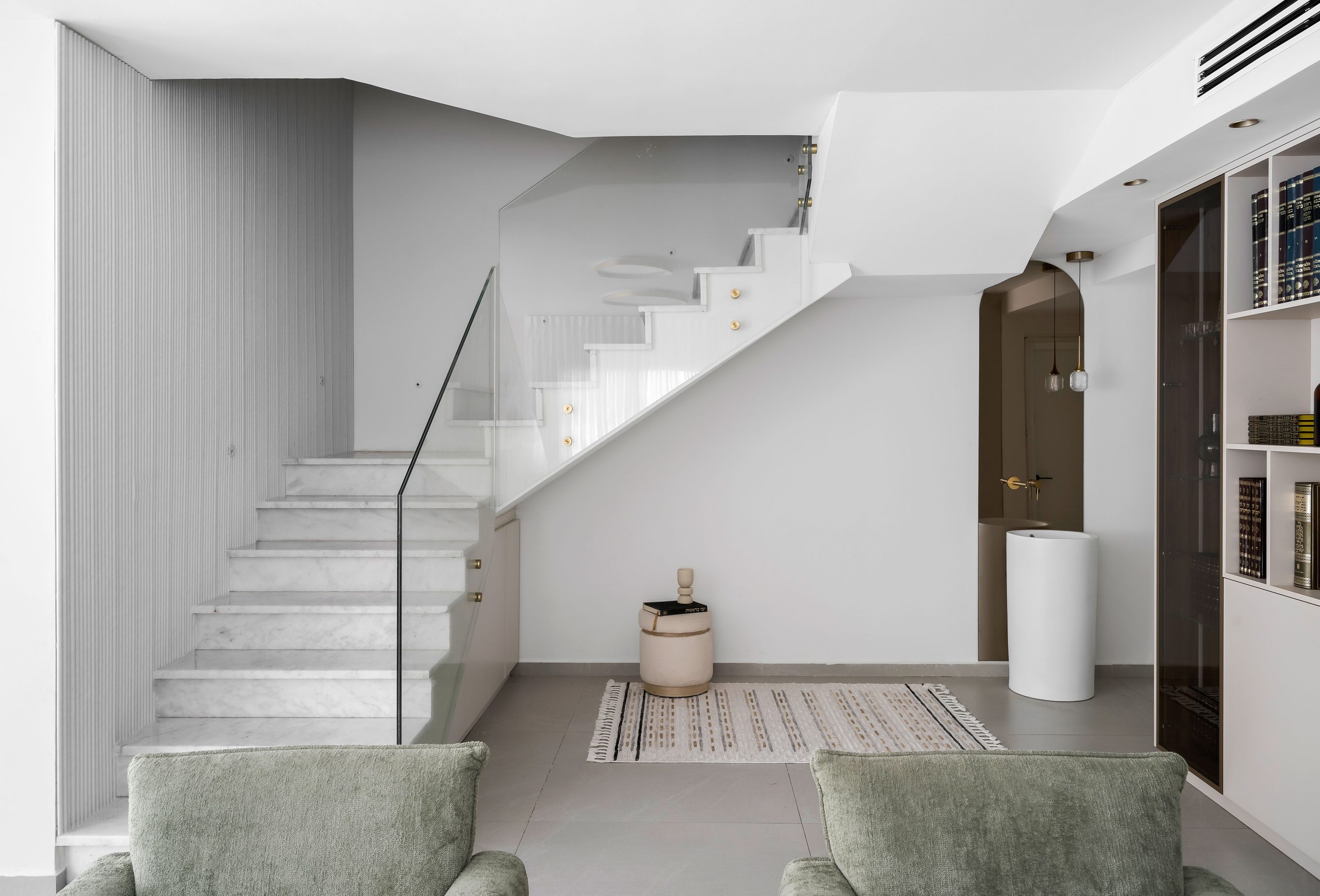 במרכז החלל מיקמתי את ספריית הקודש ופינת נטילת הידיים אשר קיבלה מראה יוקרתי, בסמוך ליציאה משירותי האורחים.