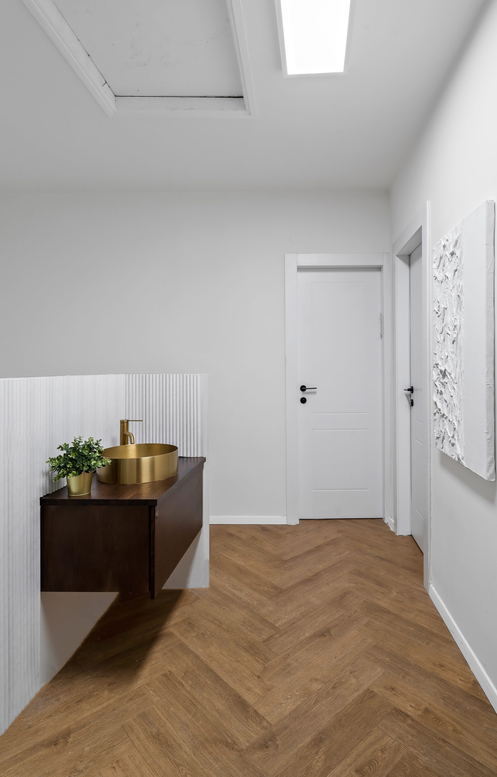 במפלס העליון הלבשתי את הרצפה בפרקט פישבון, הקטנתי את המסדרון לטובת הגדלת החדרים